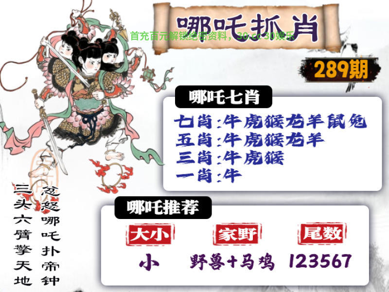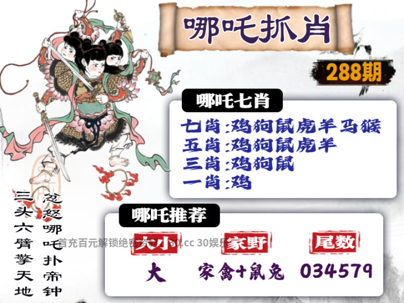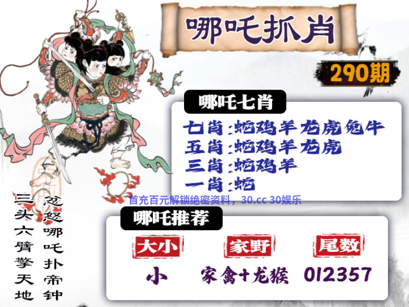291期: ①七肖中特:鸡龙兔马虎猪牛 ②大小中特:大数 ③家野+2肖:野兽+鸡马 ④精准六尾:124578 |